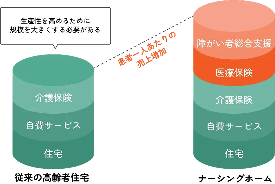 そのような方々を支援する制度の関係から1人あたりにかけることのできる医療費が上がり、結果として従来の高齢者住宅の2~3倍もの売上を見込めるようになります。