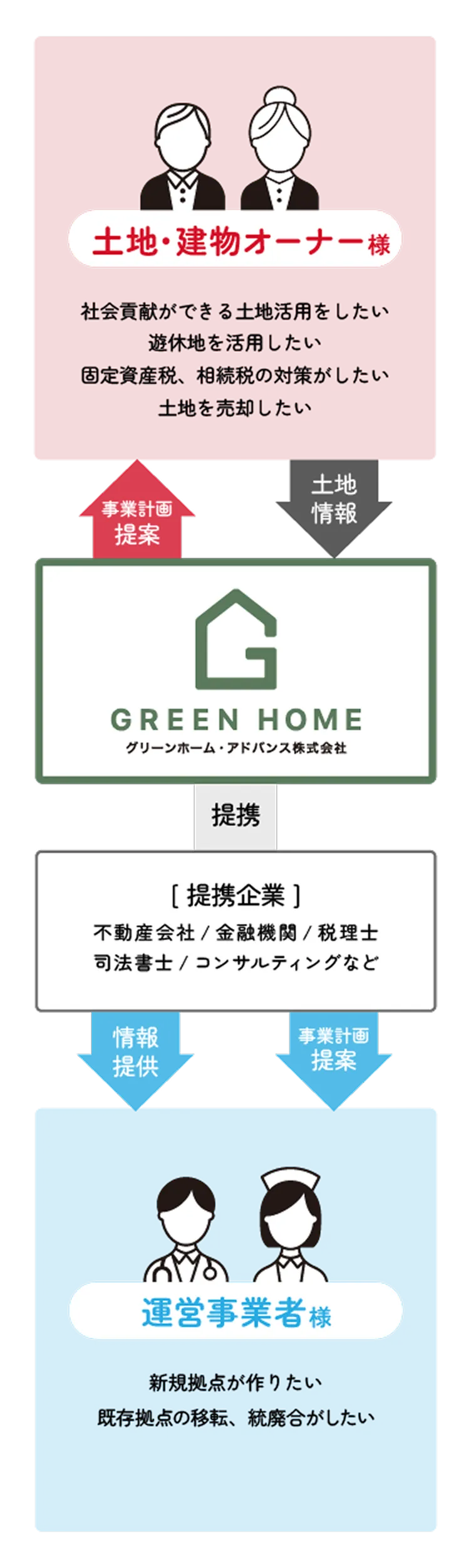 弊社では土地・建物の情報をナーシングホームの運営を行いたい事業者様にご紹介し、土地・建物所有のオーナー様と、運営事業者様とのマッチングを行っています。